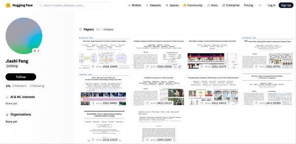 冯佳时的Hugging Face主页显示,字节跳动的视频多模态大模型Sa2VA、自回归视频生成模型VideoWorld等研究论文,他均在作者之列。